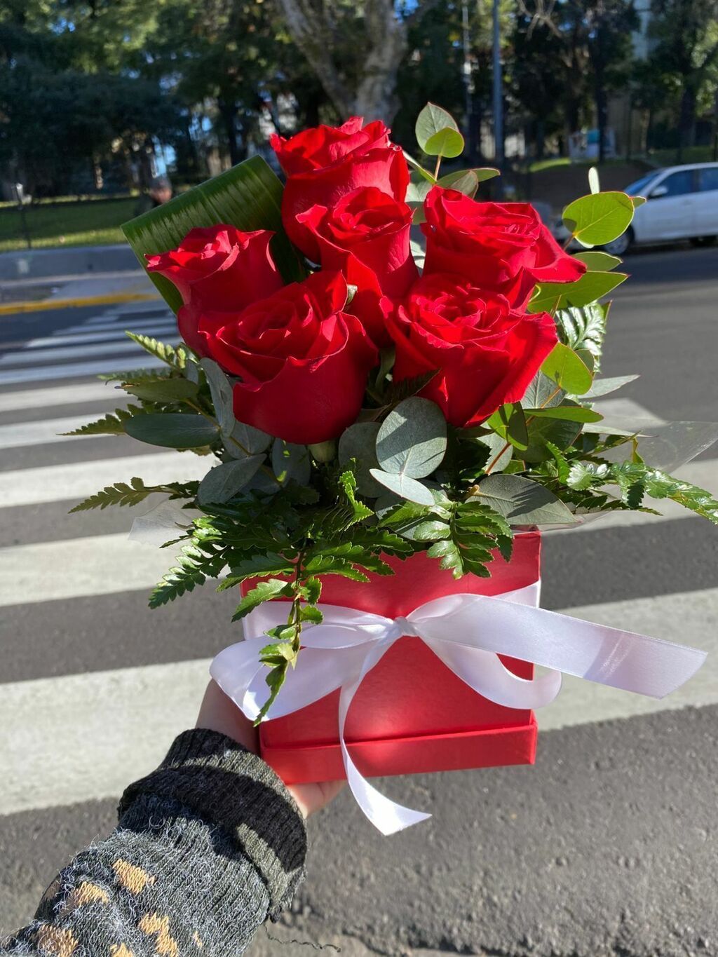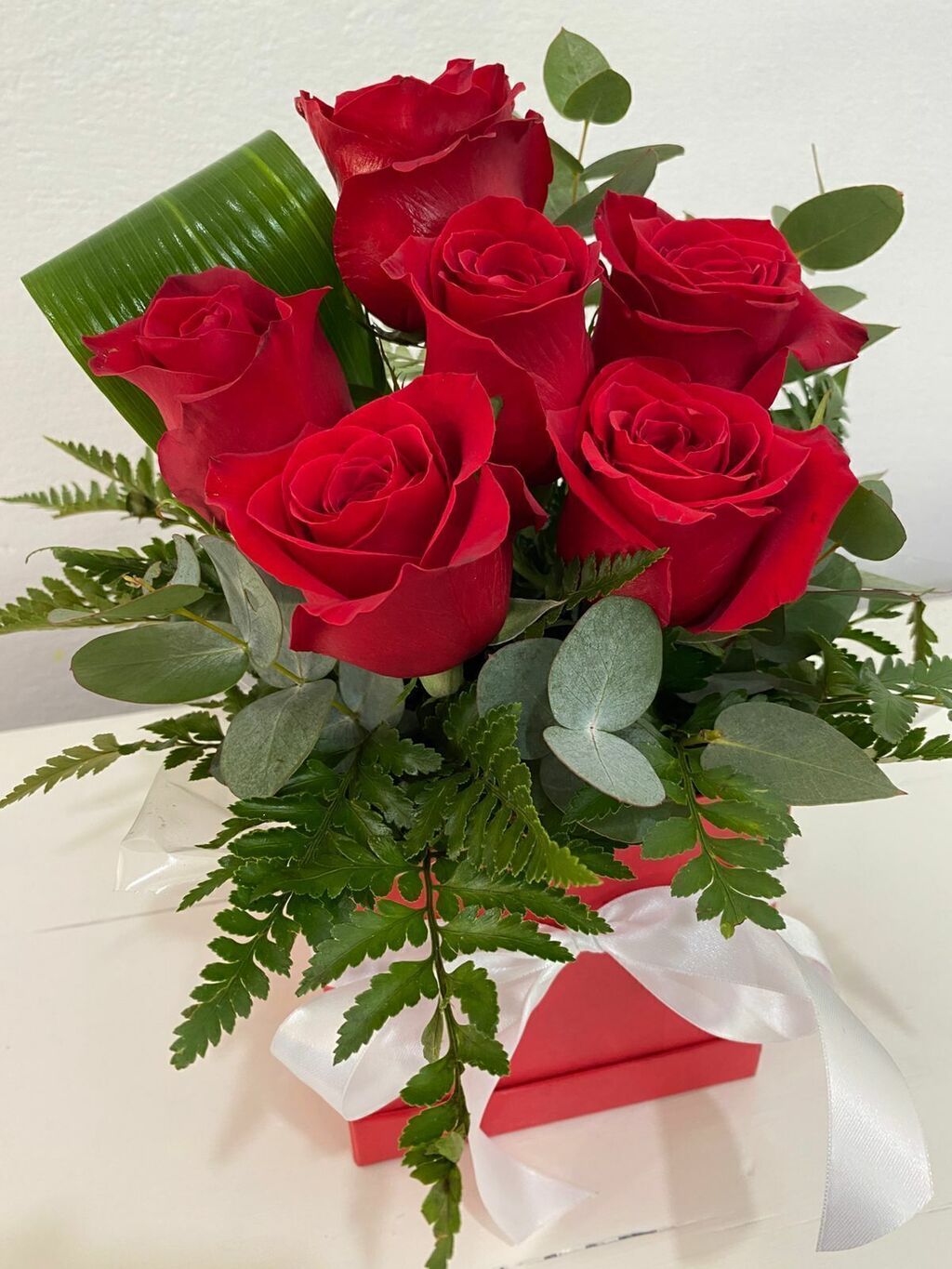 Caja de 6 Rosas acompañada de follajes.
